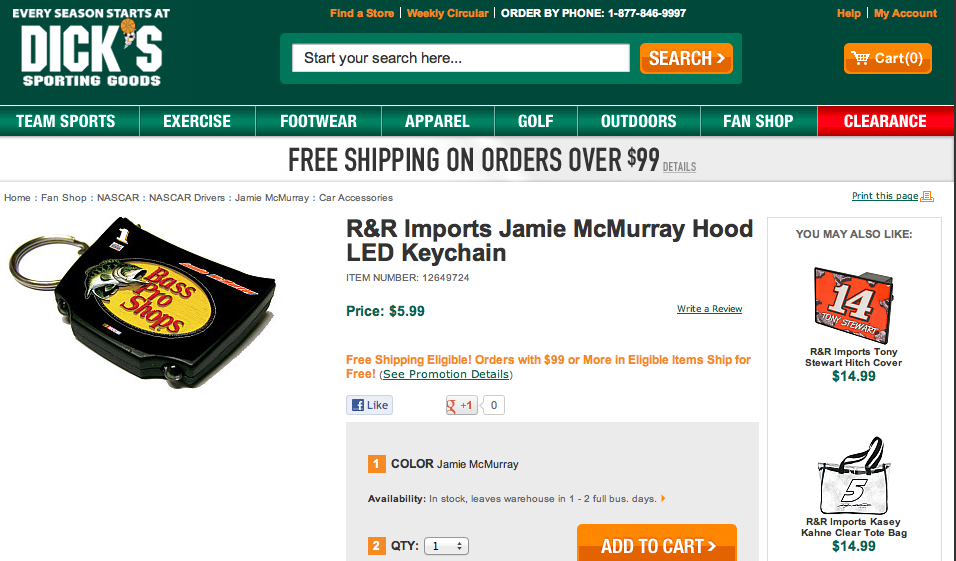 3.  You work for Dick’s Sporting Goods and inadvertently stocked your chain of stores with 2,417 worth of keychains advertising your major competitor Bass Pro Shops. (See screen cap of Dick’s Sporting Goods Below.)  It seemed like a good idea, because technically, these were NASCAR key chains and Bass Pro sponsors Nascar driver Jamie McMurray.