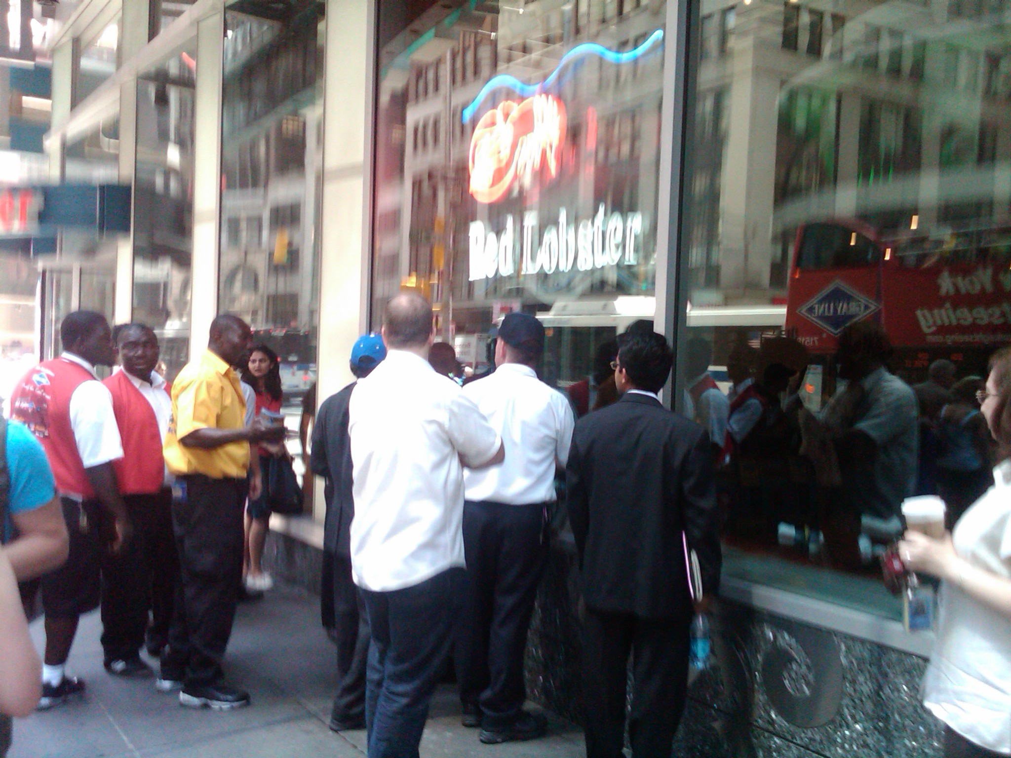 The only thing worse than missing a helicopter ride to Yankee Stadium with Derek Jeter, is missing the game, and having to watch it through the window of a Times Square Red Lobster, like these sports fans!